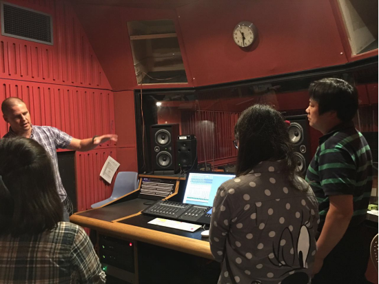 在结束完音乐制作的课程后,我们去到了录音室,参与了录音师Ben和Mary教授的研究生录音教学课,他们教同学们如何调节和摆放录音设备,从如何控制调音台,如何摆放话筒到如果连接耳机线,录音师Ben和教授Mary都是细心的教着,我们遇到困惑的,他们也会耐心的解答。我们的赵老师和Mary教授就一些设备和一些技术问题,进行了愉快的交谈!