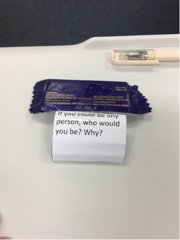 在麦考瑞访学期间,老员工活是十分丰富多彩的。老师常与同学一起做游戏,通过游戏让同学投入其中并对语言这门课感兴趣。今天的英语课堂中我们进行了“传礼物”的游戏:当音乐停止时,拥有“包裹”的同学,需要剥开一层纸,查看里面是否有装有英语问题的巧克力礼物,回答问题时间为30秒,全程只能用英语回答。这有助于同学们的口语与应变能力,能极大的调动员工对英语的兴趣。之后我们与身边的人问题互换,用固定的句型来回答问题,有助于大家对今日所学内容加深印象。