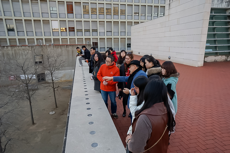 在米歇尔教授的带领下,访学团参观了整个公司。在到达公司的天台时,教授示意访学团向下俯瞰一块S型绿地,并向访学团成员介绍了自己的设计:“天台下面的这一块区域曾经被废弃,后来形成了一个土丘。而公司希望我参与土丘的设计,让它变得可利用。所以我决定将它设计成‘S’型,带有一定的曲面空间,这可以方便公司的员工,他们可以在上面休息,或坐,或躺。”其巧妙的构思赢得了访学团成员的一致好评。