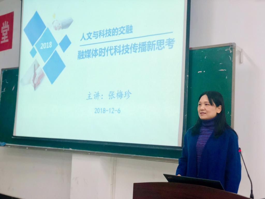 2018年12月6日晚,一场主题为《人文与科技的交融——融媒体时代科技传播新思考》的讲座在yl7703永利1104教室举行,主讲人为公司张梅珍教授。本次讲座系“艺术与传媒系列讲座”第八讲,副经理曾健友主持,公司全体2018级研究生参加。