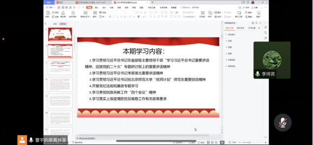 各教工党支部根据《关于开展2022年9月份“支部主题党日”活动的通知》要求,结合本支部实际,通过线上线下相结合的学习方式,观看集体走访赴武大“敦煌考古特展”、自由发言讨论、过政治生日等多种方式开展集中学习。