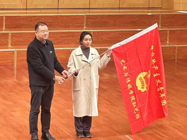 第五项,公司员工会主席金煦婷作为公司代表发表讲话。她提到,作为团学骨干,要凝聚青春力量,共同构筑团学梦想,做到信念坚定、政治过硬、能力突出、作风优良。随后,公司党委书记晋曦为“弘艺班”授旗。
