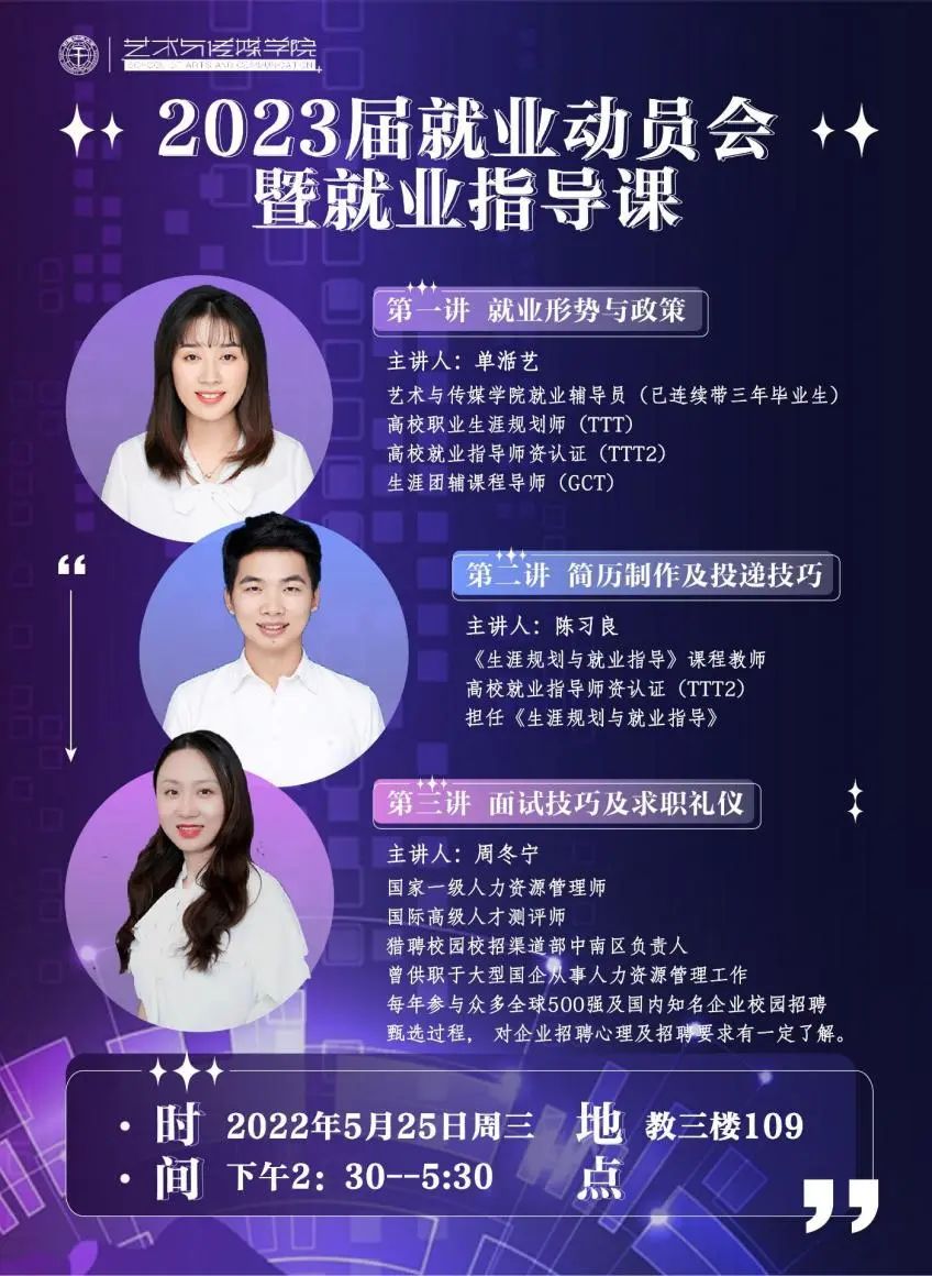 为全面贯彻《永利官网关于进一步加强员工就业工作的通知》的文件精神,深入落实员工就业工作专题推进会上的安排部署,紧紧围绕立德树人根本任务,促进2023届毕业生更加充分更高质量就业,yl7703永利积极实施毕业生就业促进行动。5月25日下午,yl7703永利2023届就业动员会暨就业指导课在南望山校区教三楼109教室举行。本次就业指导课以线上和线下的方式相结合,课程内容分为就业形势与政策、简历制作及投递技巧、面试技巧及求职礼仪三个部分。