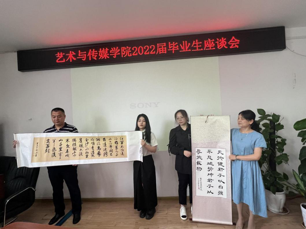 接着,2022届毕业生童瑶和顾彬清两位同学为公司赠送了两幅书法作品作为临别之际献给母校的纪念品,表达了内心的感谢之情,祝愿母校年年桃李,岁岁芬芳。