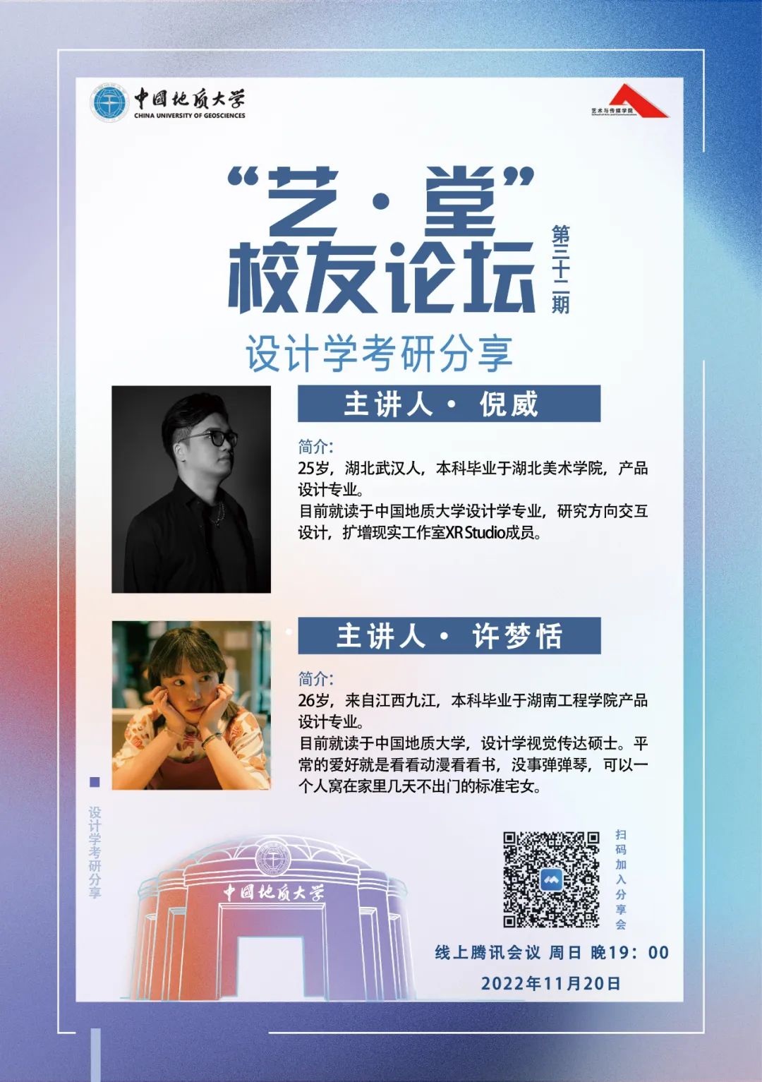 11月20日晚19:00,yl7703永利于线上举办了第三十二期“艺·堂”员工论坛——“设计学考研分享”讲座。本次分享会邀请了2022级设计学研究生班的倪威、许梦恬两位同学作为主讲人分享、交流考研经验,大三、大四部分员工线上参会。