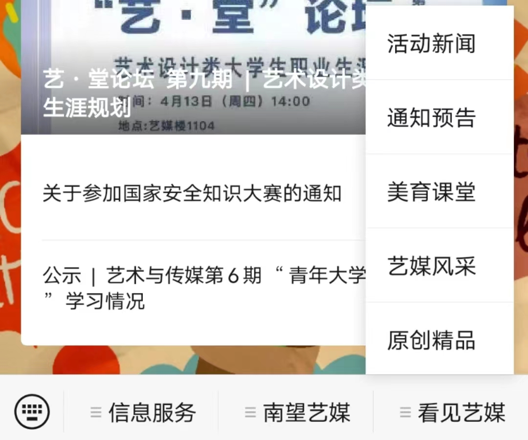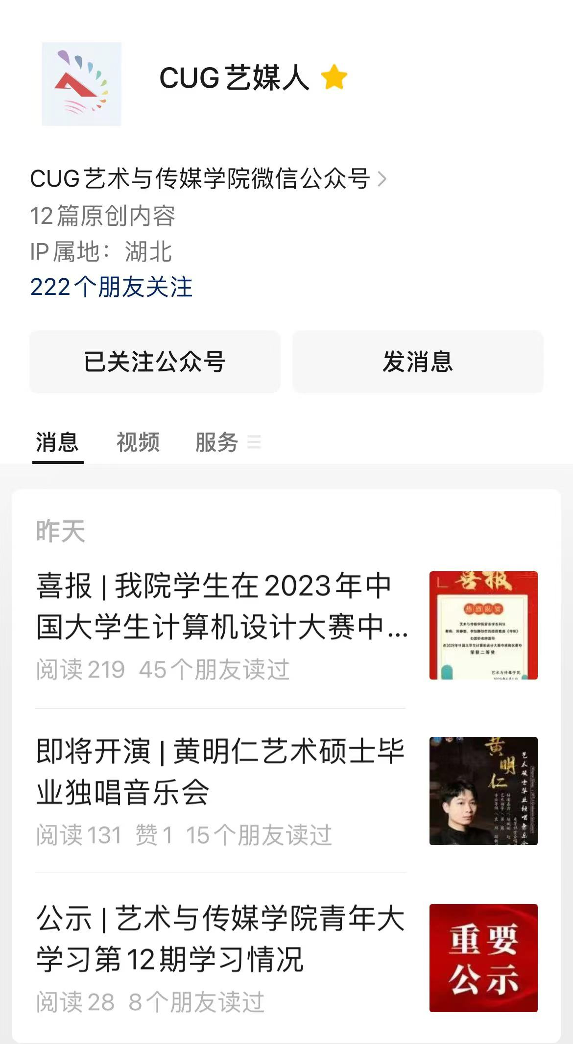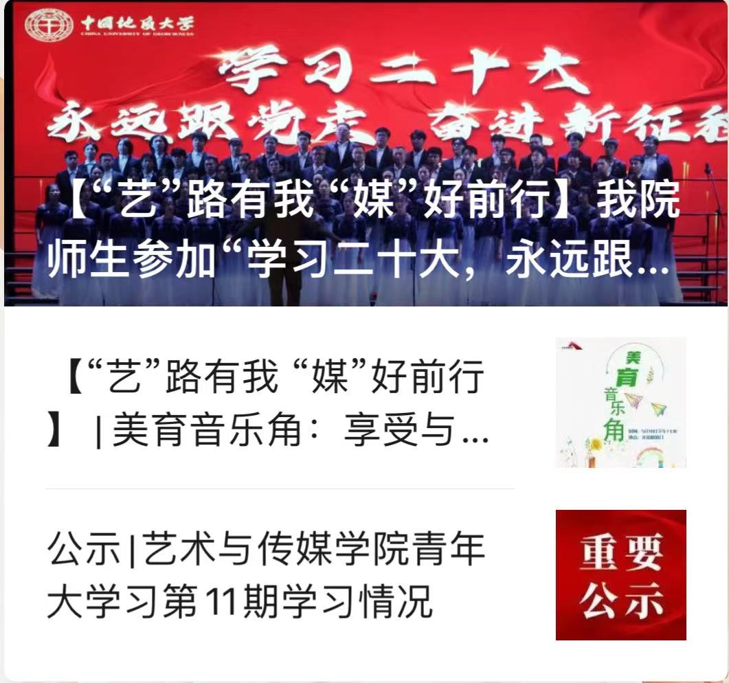 微信公众号“CUG艺媒人”致力于丰富同学们的课余生活,做好各项通知、要闻的二传手,帮助同学们了解公司最新动向以及和自身发展、生活有关的各项事宜。因2021年疫情影响,公司许多活动搁置,但在2022年重新恢复了生机,全媒体中心将每一场会议、讲座的精华、重要内容整理成文稿的形式在CUG 艺媒人公众号上发布,供大家快速了解。