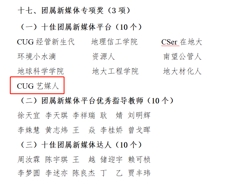 在公司近期“五四评优”活动中,公司官方微信公众号“CUG艺媒人”以特色鲜明的版式设计、持续性的优质内容输出、准确的角色定位等荣获“十佳团属新媒体平台”、全媒体中心王越荣获“十佳团属新媒体达人”、曾戈晖荣获“团属新媒体平台优秀指导教师”。