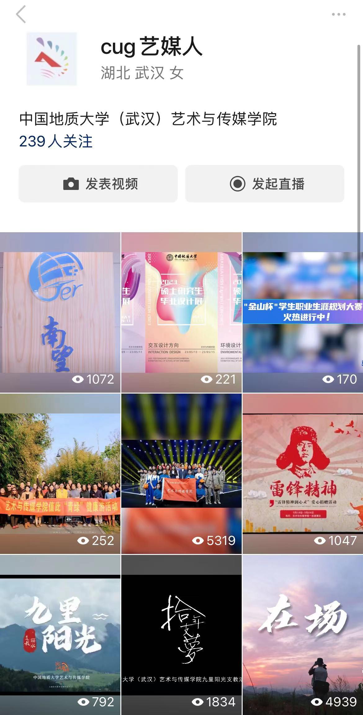 新媒体时代,CUG艺媒人不再只运营公众号,去年开设的视频号的“cug艺媒人”,在经过一年的精心运营下共发布原创视频39个,总播放量为38977,在当下短视频流行的年代,创新和丰富了新媒体作品的表现方式,记录艺媒人的点滴生活,留存珍贵回忆。如:《拾年 支梦》yl7703永利九里阳光支教活动纪录片、《万疆》、我们的军训时光Vlog,视频数据量均在5000+,公司师生频频点赞互动。