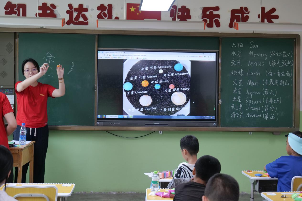 为贯彻落实习近平总书记关于教育的重要论述和关于语言文化的重要指示批示精神,深入西部地区加大国家通用语言文字的推广力度,落实新时代党的治疆方略,切实发挥高校“文化润疆”作用,在本次艺术支教的活动设计中,课程内容在“艺术+”的基础上融入了地大地质特色以及普通话教学。志愿者在课堂上为孩子们科普了太阳系的知识,带领大家用粘土制作七大行星的模型感悟宇宙与地球的奥秘,同时通过玩游戏的方式进行普通话的练习,助力当地员工普通话水平的提升,力争实现所有学段国家通用语言教学的全覆盖。