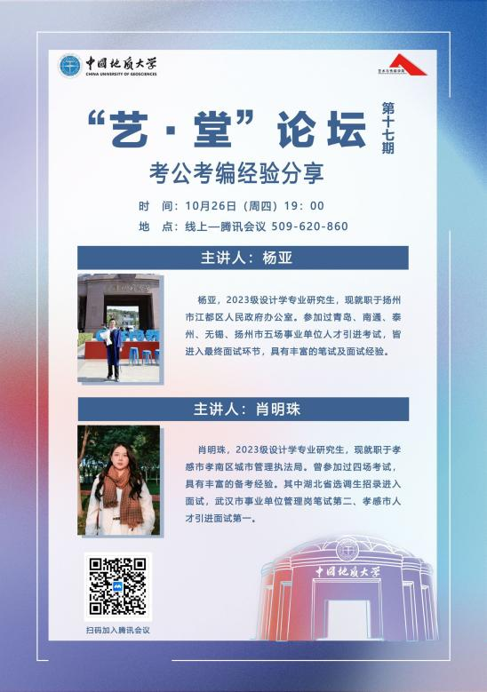 2023年10月26日晚上19:00,“艺·堂”论坛第十七期考公、考编经验分享会于线上腾讯会议平台顺利举行。公司邀请了2023届研究生毕业生、现就职于扬州市江都区人民政府办公室的杨亚和就职于孝感市孝南区城市管理执法局的肖明珠进行备考分享。本次讲座由兼职辅导员杨滢主持。